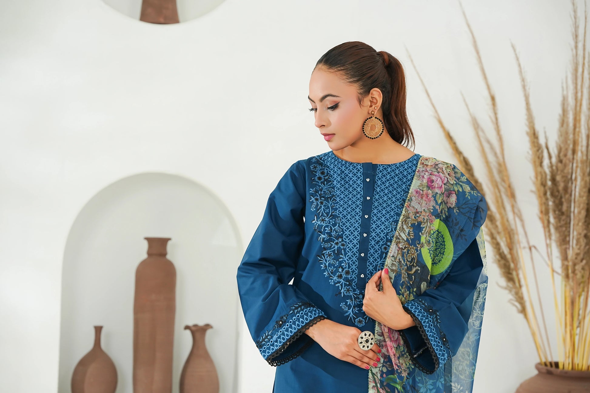 Add a refreshing and elegant vibe to your wardrobe with the Teal variant from Amna Khuram’s JAL Embroidery Collection. This stitched 3-piece outfit features a beautifully detailed JAL embroidered neckline on premium cotton lawn fabric, paired with a flowing georgette printed dupatta and a comfortable plain cotton trouser.